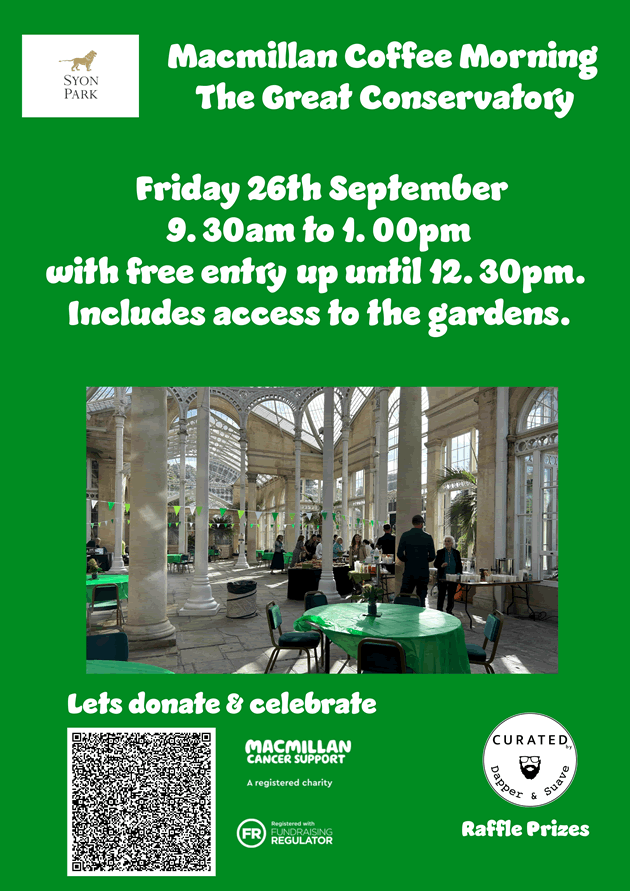 So come along on Friday morning, enjoy a coffee and buy some raffle tickets in the spectacular surroundings of the Great Conservatory and then have a wander round the extensive Syon Park gardens.