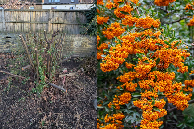 Lack of expertise blamed for the over aggressive culling of this Pyracantha (left) which should have been fruiting at the time (right). Picture: Friends of Parks Forum